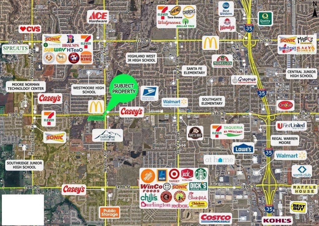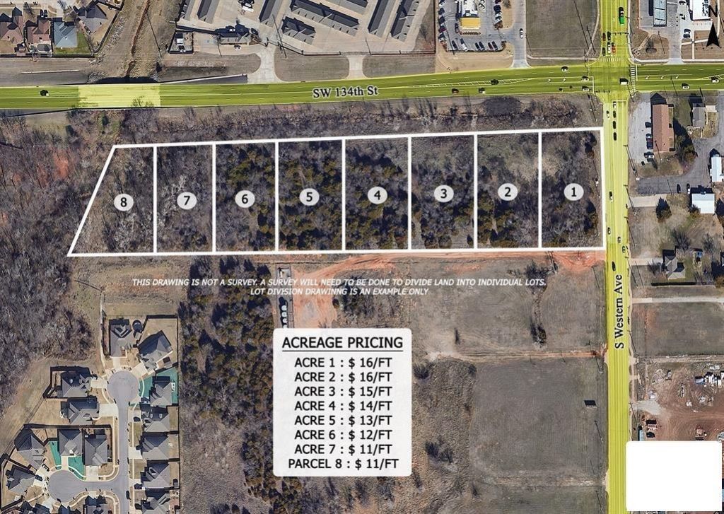 GREAT Location with HIGH TRAFFIC COUNT! This 2 Acre parcel of PRIME COMMERCIAL LAND is located on a HARD COMMERCIAL CORNER (#1 as shown in photo of drawing), ZONED C-3 w/ frontage facing both SW 134th St. and S. WESTERN AVE. This property is located beside booming growth of new Residential & Commercial construction. The property sits directly on the West side of S. Western Ave. with Western widened by the City to 4 LANES to accommodate higher traffic. WESTERN Ave. is a main thoroughfare route all the way to the college town of Norman, OK. The widening of the road helps with OU game traffic and busy rush hour traffic. This property is minutes to Will Rogers World Airport. McDonalds restaurant sits directly across the street. PERFECT location for a Hospital, Urgent Care, Bank, Restaurant, Strip Mall, Offices, or any one of multiple types of Retail Spaces! This acreage is part of a Larger parcel OTHER ADJOINING PARCELS can be sold along with this one, up to a total of 8.42 acres. (Taxes will be adjusted with purchase). Call for more information! Owner/Broker