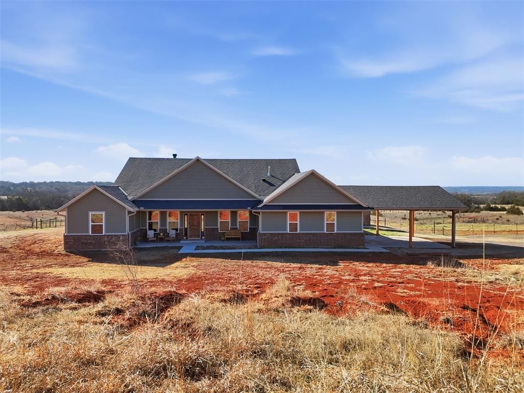 Custom-built in 2020, this 2,828 square foot home offers 5 bedrooms, 3 baths, and sits on just over 13 private acres just about 10 minutes from I-35. Designed for both comfort and functionality, the home features stained concrete floors, professional-series kitchen appliances, a large walk-in pantry, and a coffee bar with beverage fridge. Spacious laundry room with sink. Two fireplaces - one in the living room and one in the primary bath beside the soaking tub - add warmth and character. Unique layout includes two primary suites. For added peace of mind, the home also includes a walk-in tornado shelter. Enjoy beautiful southern views from the large covered back porch. Ideal for privacy, horses, or cattle.