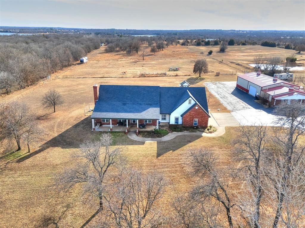Custom-built country estate on 10 fenced acres with pond, creek, and mix of cleared and wooded acreage. The 4,553 sq ft main home offers large rooms, engineered hardwoods, plantation shutters, crown molding, custom built-ins, and a cozy wood-burning fireplace. Two primary suites (one up, one down) provide ideal flexibility. The main living areas showcase engineered hardwood floors, beautiful kitchen with under cabinet lighting and granite, (will have new double oven installed), and an open, airy eat in dining space that flows seamlessly into the living room-creating ideal gathering space. The living area features custom built-ins, a cozy wood burning fireplace, and elegant crown molding, while barn doors add character and function at the entry. Plantation shutters highlight the home. The downstairs primary suite offers private access to back covered patio, a huge walk in closet, jetted tub, and walk in shower with dual shower heads. Upstairs offers a private bedroom with full bath, walk in closet, a half bath off of spacious bonus room, and a separate living space currently set up as home theatre. The property also features an attached 2,400 sq ft shop with 3-phase electric, skylights, office space, bath, custom cabinetry, RV hookup, and three tall insulated overhead doors. Office space (or extra storage room) in process of being redone, fresh drywall, LED lights, and new attic door. Connected guest quarters include two bedrooms, living area, kitchen, and bath-perfect for multigenerational living , income potential, or home business. Underground storm shelter outside for peace of mind during storm season. Just 5 minutes from Shawnee Twin Lakes and located in the highly desired Dale Schools. Can be purchased with additional 20 acres, MLS #1209540