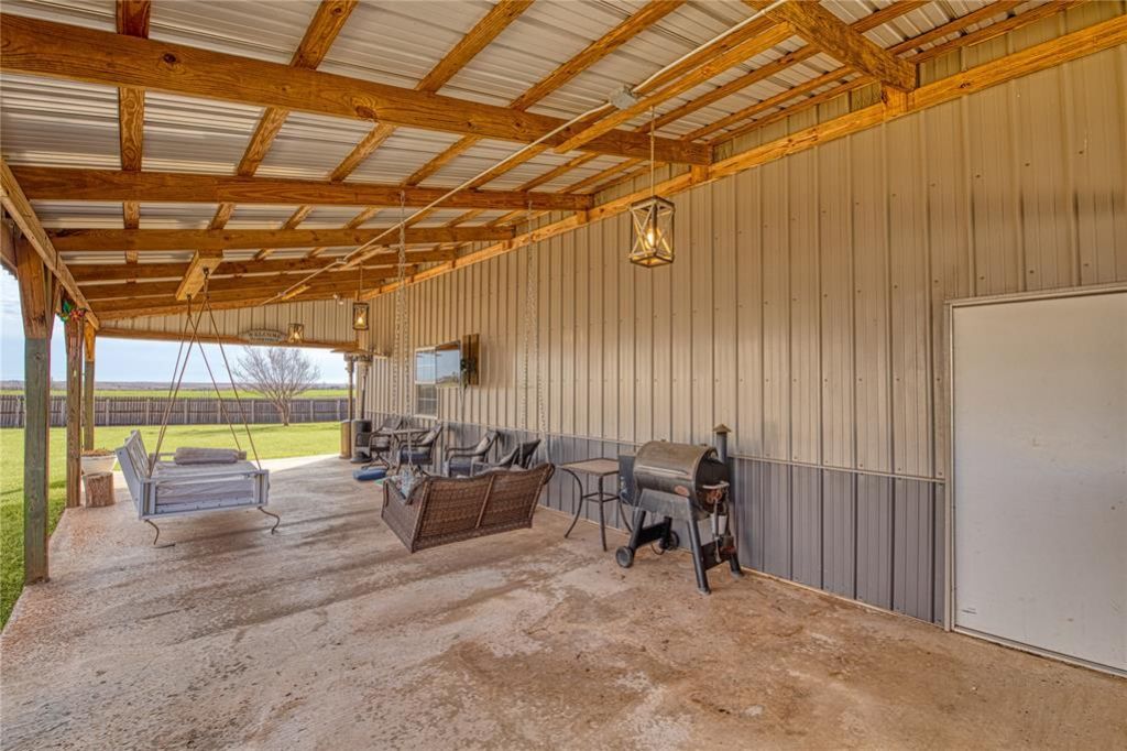 Welcome to serene rural living in Leedey, Oklahoma-known for its community & charm. This modern farmhouse offers stunning country views, a smart spacious floorplan, indoor/outdoor entertaining spaces, an insulated workshop, covered back patio, full RV hookup, and ample extra parking.Inside: Gourmet kitchen with custom cabinets, stainless steel appliances, and large walk-in pantry. Living room features vaulted ceilings w/ custom wood beams to match the wide wood trim. Master suite boasts walk-in closets with built-in dressers, plus a bath with enormous custom shower, soaking tub, his-and-her sinks, and private toilet. All bedrooms are spacious with walk-in closets. Large laundry room includes storage and hanging space. Outside: 30x50 insulated workshop with overhead doors, bathroom, finished living quarters (heated/AC), and loft storage. Large covered patio w/ custom lighting and plenty of room for entertaining. Wood privacy fence, landscaping, flower beds and ample hydrants for gardening. Property spans 10 lots for plenty of space and views. Experience modern amenities in peaceful Oklahoma countryside!